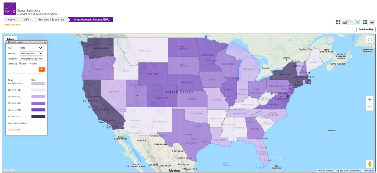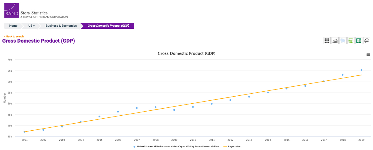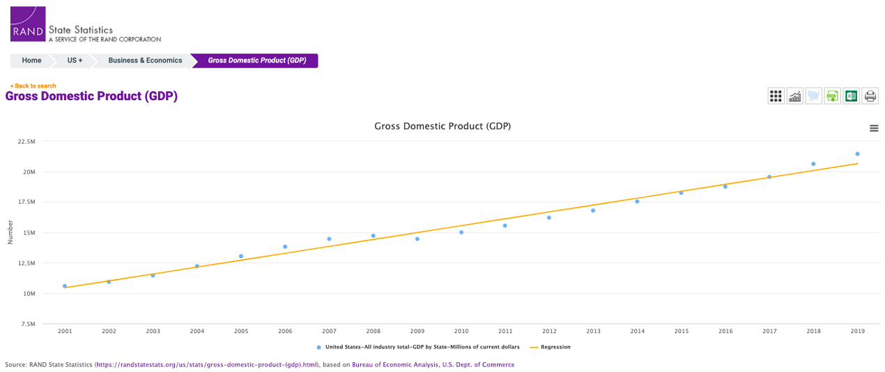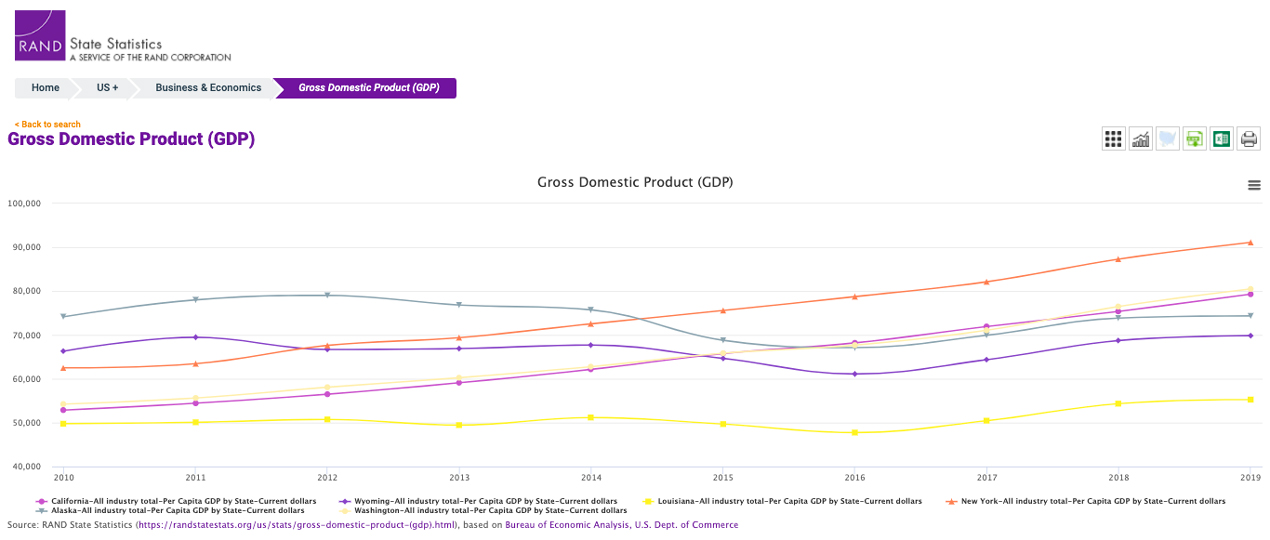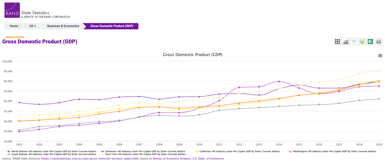 RAND State Statistics recently updated its Gross Domestic Product (GDP) database with GDP by state and GDP Per Capita in nominal and constant or "chained" (2012) dollars, from 2001 to 2019. The data is based on North American Industry Classification System (NAICS) categories and the per capita figures are based on July 1st population data from the Bureau of the Census. Here are some of the highlights.