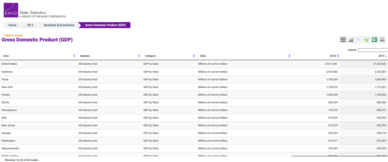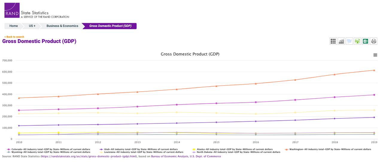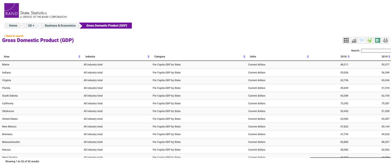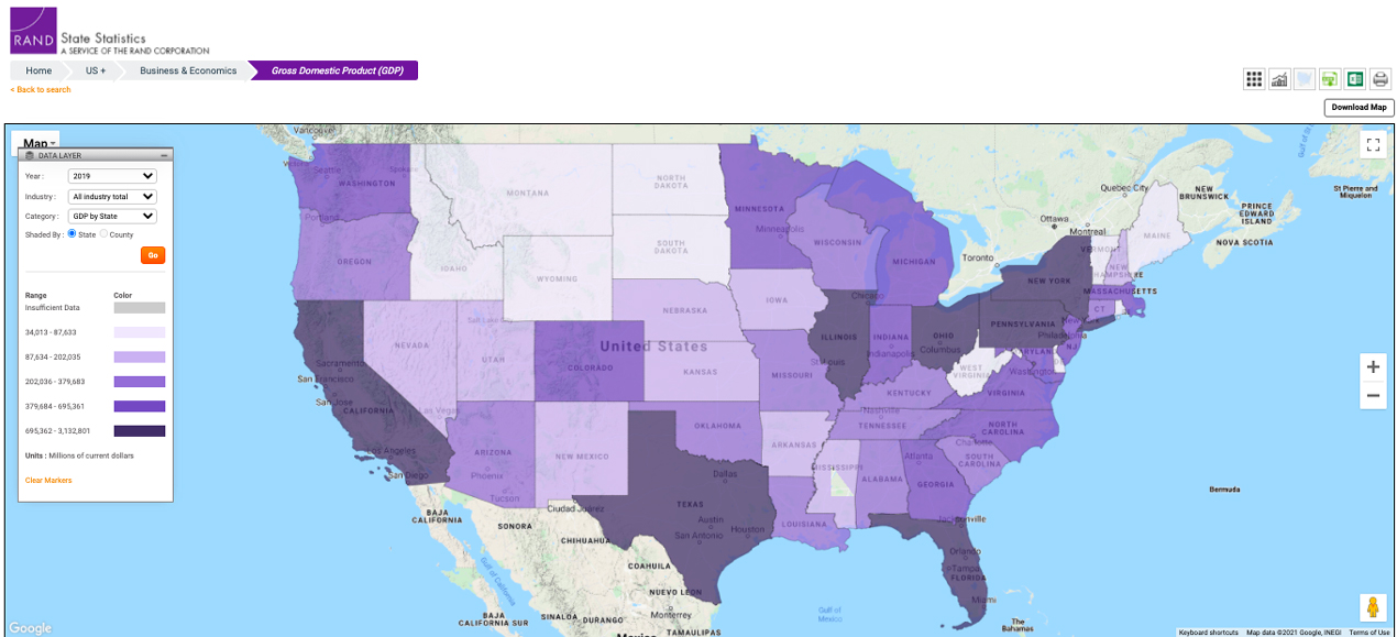 RAND State Statistics recently updated its Gross Domestic Product (GDP) database with GDP by state and GDP Per Capita in nominal and constant or "chained" (2012) dollars, from 2001 to 2019. The data is based on North American Industry Classification System (NAICS) categories and the per capita figures are based on July 1st population data from the Bureau of the Census. Here are some of the highlights.